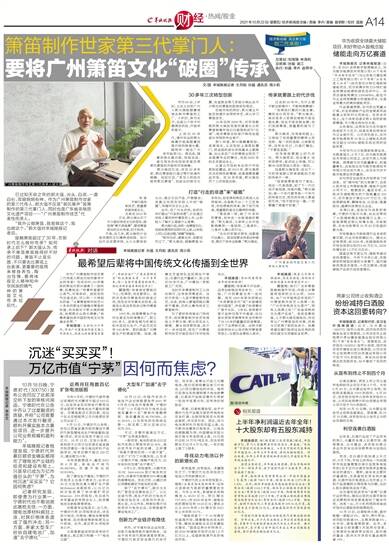 郭汝灼:传承离不开创新,没有创新就没有生命力。一开始,广州的箫笛也有一些问题。我在1963年率先研制出“木质箫笛系列”和“半音键改良中国笛”,并组建了岭南管乐厂笛子乐队。3年后,我有感于笛子品种仅限于中高音,还与音乐家陈芳德等专家合作制作了长1.8米的重量级低音横笛,创下了业界新纪录。这种不断创新的快乐让我对制作箫笛更有信心,也更加全情投入其中。