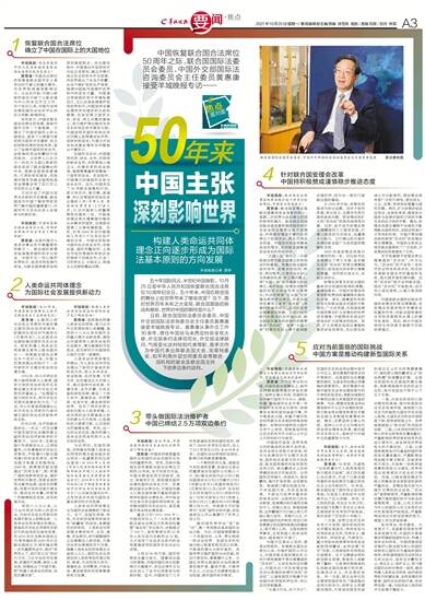 黄惠康:中国合法席位的恢复是联合国历史上具有划时代意义的重大事件,对世界格局演变影响巨大。从这天开始,中国以崭新的姿态开始了以联合国为中心的多边外交工作。半个世纪以来,中国为全球治理和国际法治所作出的巨大贡献,影响深远。