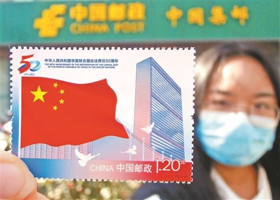 中国邮政25日发行《中华人民共和国恢复联合国合法席位50周年》纪念邮票一套1枚,全套邮票面值1.2元。邮票计划发行数量为700万套 人民视觉供图