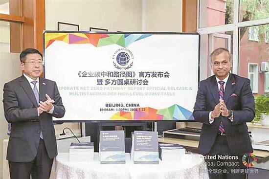 联合国驻华协调员常启德(Siddharth Chatterjee)、国务院国资委副主任、联合国全球契约组织理事任洪斌(左)发布《企业碳中和路径图》 采访对象供图