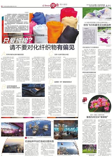 面对名称非常“学术派”的人造纤维,我们该如何区分呢?很简单,在购买纺织品和服装时常见到的以“纶”结尾的纤维,一般都为化学合成纤维。例如涤纶、锦纶、腈纶、氨纶、丙纶等。合成纤维是以小分子的有机化合物为原料,经加聚反应或缩聚反应合成的有机高分子化合物。大部分合成纤维的源头都是来自石油,石油化工系统经过层层提取、分离,得出生产这类纤维所需要的小分子有机化合物。