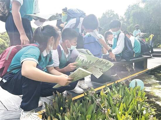 上周六,广州市第五中学七年级的近百名同学来到刚刚发现昆虫新物种——海珠斯萤叶甲的海珠湿地公园做生物课作业,参加“植物猎人的环岛之旅”活动。同学们化身“植物猎人”,在导师任务单的引导下分组比拼,观察岛上的物种、调研生态圈样本并制作标本。在真实的情境下,同学们灵活运用课本知识,在老师的引导下学会提出问题、进行深度思考。