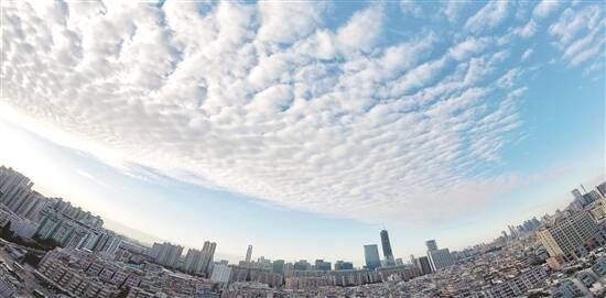 这是今天上午从天河区棠下看上去的天空。由于冷空气南下,广州出现罕见鱼鳞云,层层叠叠,蔚为壮观。