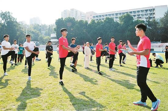 苏炳添将课程分为基础热身、跑动系列及放松三部分。他向同学们讲授摆臂、步伐等动作细节,并全程指导(上图)。苏炳添透露,“我每一次训练仍会很重视基础动作细节,这些就是我的‘绝杀武器’。”他演示并耐心指导,甚至平躺在地,分析动作,他鼓励大家日常多多锻炼,“每一个动作都要做成‘有效动作’,回去宿舍还要加强练习”。