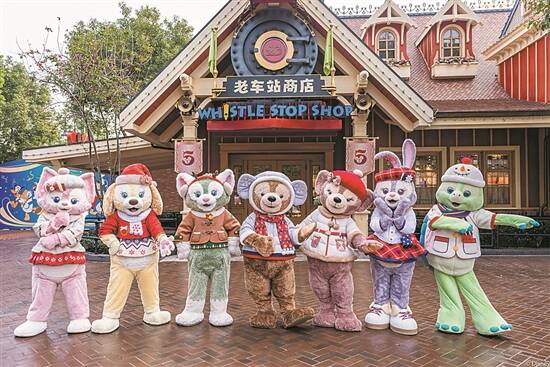 玲娜贝儿(左一)与其所在的达菲家族换上最新的冬日服装卖萌迎客
