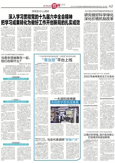 羊城晚报讯 11月26日,省委书记李希到中山市,深入农村、企业、创业孵化平台和河涌整治项目现场,就全面贯彻落实习近平总书记在党的十九届六中全会上的重要讲话精神和全会精神、推动“十四五”开好局起好步进行调研。