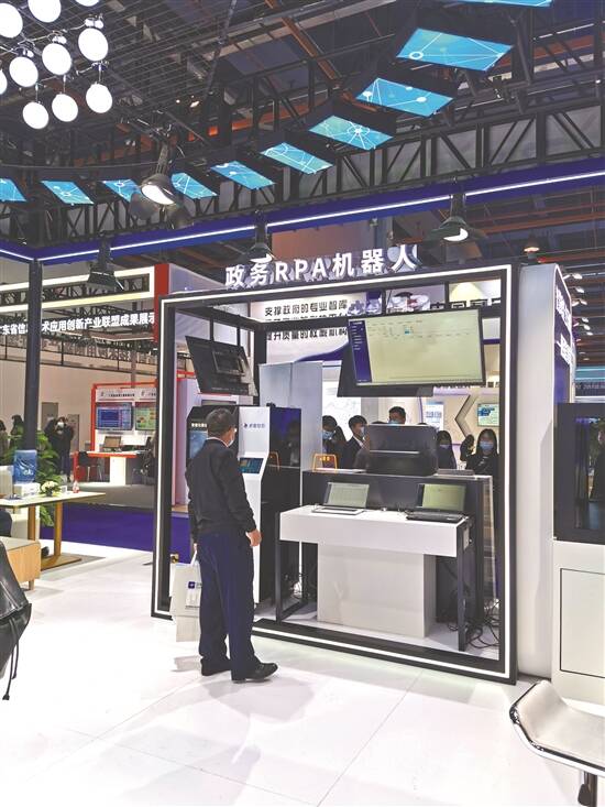 在数字政府的建设中,肯定少不了各种科技神器的加持。在2021(第十六届)中国电子政务论坛暨首届数字政府建设峰会成果展上,记者看到了不少既实用、又好玩还便民利民的科技神器,各家展台集中展示了AI+城市、AI+医疗、AI+教育、AI+办公等多领域的人工智能解决方案,展现数字经济赋能各行各业的创新成果,吸引了不少参观者打卡体验(见上图,林曦 摄)。