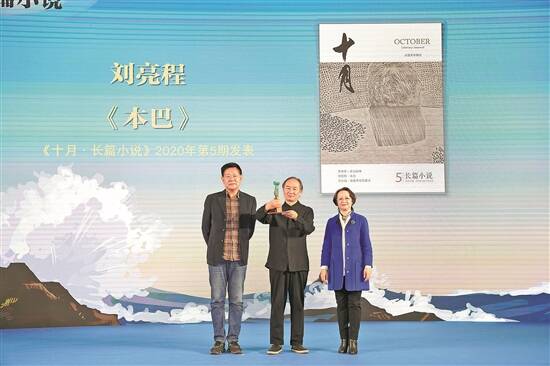 著名作家、2020花地文学榜年度长篇小说得主邓一光(左)与广东省作协党组成员、专职副主席苏毅(右),一起为刘亮程颁奖