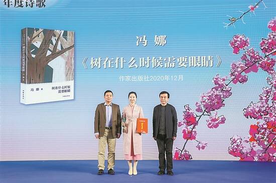 中国作协主席团委员、中国诗歌学会会长杨克(左)与深圳市文联党组书记、主席梁宇(右),一起为冯娜颁奖