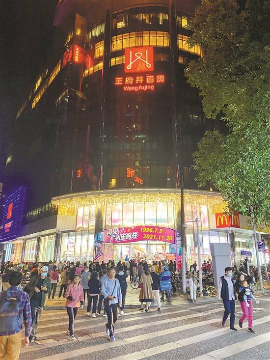 11月30日入夜,农林下路灯光如昼,这一晚最受瞩目的当属昔日广州百货业的龙头企业广州王府井百货。一个月前,广州王府井百货发布公告称,“因商场物业租赁合同到期,广州王府井百货将于2021年11月30日闭店后停止营业”。