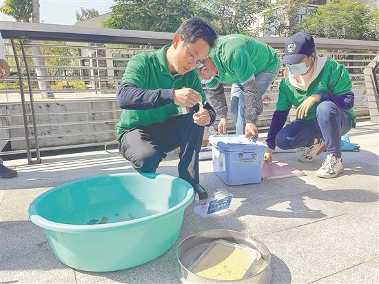 “很多冷冰冰的数据孩子们是看不懂的,所以我就检测水中的生物,结合生物生存的环境情况来告诉孩子们水质情况。”近日,在江门市下沙公园,赵德光带着自己的工作室成员,用自购的水质检测设备对河水进行了检测(见上图)。他先将河水放入盆中,再用滴管进行采样,在样品中滴入化学试剂后稍等片刻,将反应物同色卡一一对比后露出了笑容。