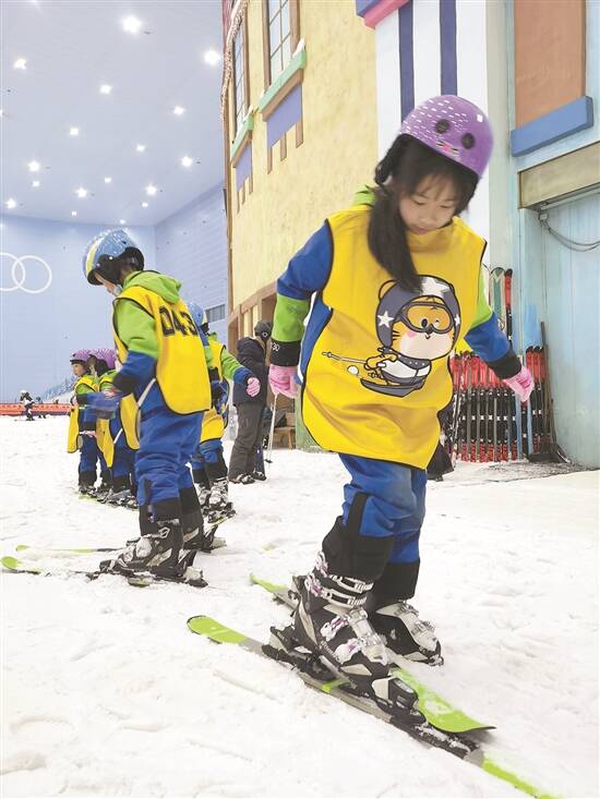 身穿黄色马甲、脚踏双板的孩子们像小企鹅一样扑棱着翅膀,一个接一个在室内雪场的初学者道上向下滑行。很难想象这是孩子们第一次上滑雪课的成果,每一个孩子都稳稳地滑到平地,稳稳地刹住了车,无一人摔跤,在一众成年滑雪者中不落下风。