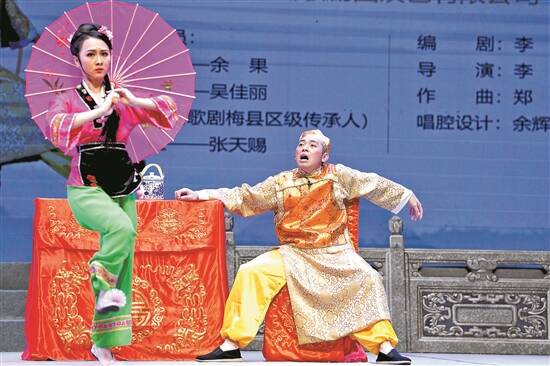 此次展演有四出客家山歌剧折子戏上演,分别是梅州市梅县区山歌剧团演艺有限公司带来的《村长嫂审鸡》《二梅看郎》,梅州市客家山歌传承保护中心带来的《相思豆》选段、《山稔果》选段。梅县区山歌剧团负责人赖瑜明说:“与大剧种相比,客家山歌剧历史较短,我们现在一方面是做透传统剧目,比如《二梅看郎》;另一方面是开拓新的、反映乡村面貌的折子戏,比如《村长嫂审鸡》。”
