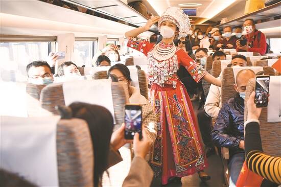 12月6日,工作人员身着苗族服饰在首趟正式运营的张吉怀高铁列车上为乘客表演 新华社发