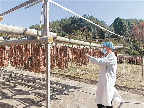 何泰山是南雄市一家企业的合作养殖户。在距离何泰山的养殖场几百米外,这家企业也有自己的晾晒场。记者在晾晒场上看到,一根根竹竿上搭着腊制好的腊肉和香肠,在阳光下冒着油光。工人们正小心调整着腊肠、腊肉的间距,好让这些腊味进行充分的风干和晾晒。
