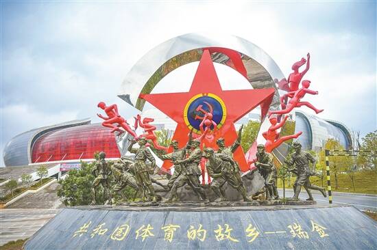 瑞金市体育中心场外雕塑上写着“共和国体育的故乡——瑞金”