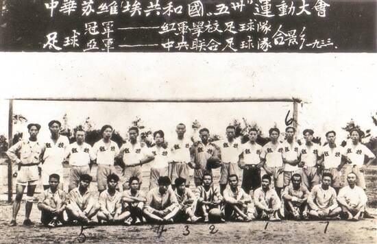 中华苏维埃共和国“五卅”体育运动大会足球冠、亚军运动员合影 瑞金中央革命根据地历史博物馆供图