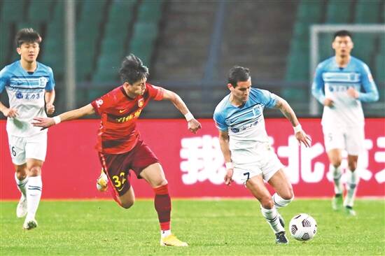 广州城队球员卡尔多纳(右)带球突破 新华社发