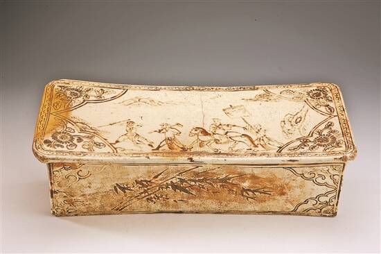 “唐僧取经图枕”是元代磁州窑的代表作品。这件瓷枕不仅是日常生活的实用器物,而且是极为精美的陶瓷工艺品。绘画和装饰图案既有花鸟画的特征,又有民间神话故事的描绘。尤其是枕上画的唐僧取经故事,为研究我国著名的神话小说《西游记》的成书过程提供了珍贵的资料。这是留存到现在的有关唐僧取经题材的早期图像之一,不但反映了民间绘瓷艺人的高超艺术成就,还是研究小说《西游记》成书历史有参考价值的实物证据。
