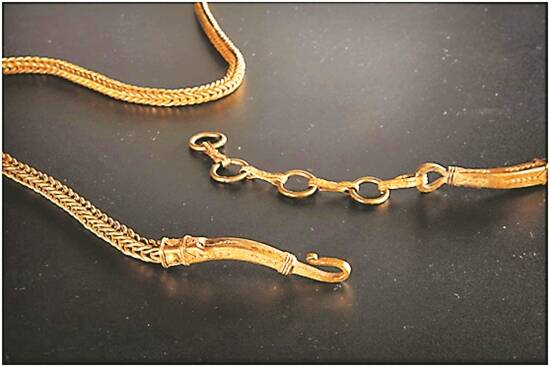 “宋金项饰”是“南海I号”沉船出水的第一件金器,由四股八条金线编织而成,其中一端有四个小圆环,可以用来调整松紧。“宋金项饰”虽沉入南海近千年,仍光彩夺目。它的工艺并非中国传统风格,暗示沉船或许与海外贸易活动有关。