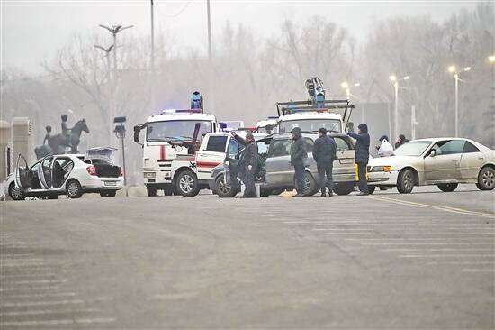 1月10日,阿拉木图街上的安全人员在执勤 图/人民视觉
