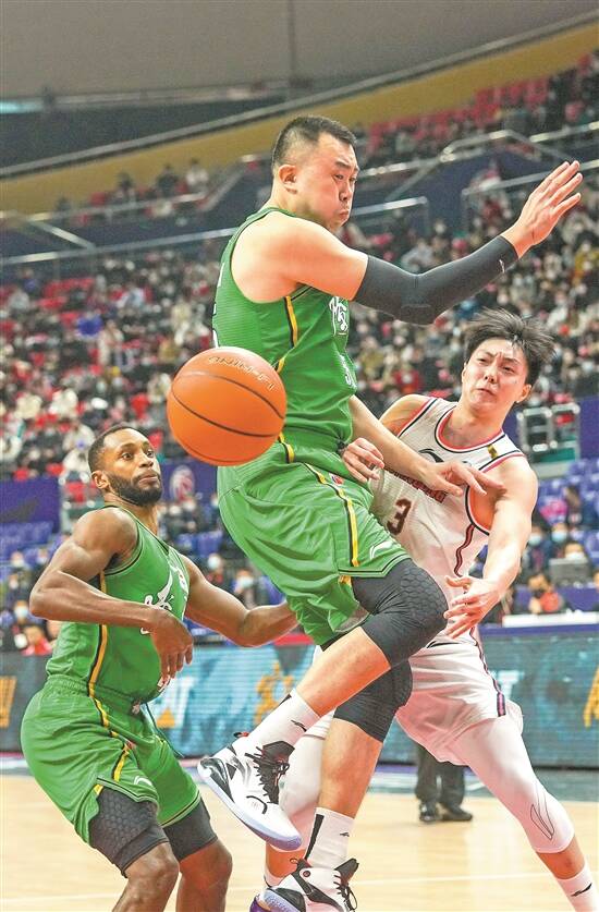 韩德君(中)在比赛中防守胡明轩(右) 新华社发