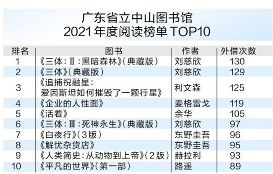 羊城晚报讯 记者黄宙辉,通讯员何靖怡、何慧敏报道:1月13日,广东省立中山图书馆(以下简称“省图”)公布了2021年度阅读榜单。其中,刘慈欣的《三体:Ⅱ:黑暗森林》、《三体》(典藏版),期刊《读者》成为省图读者最爱借阅的读物。