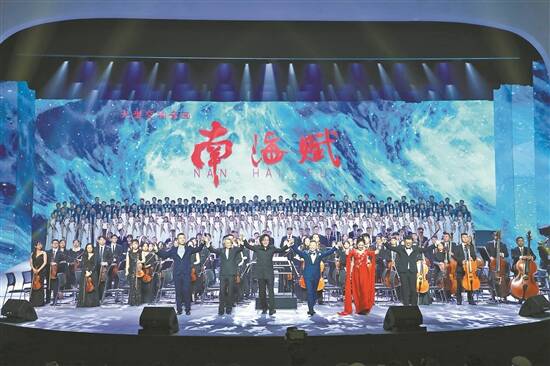 “浩浩南海,承接沧溟。碧海蓝天,星辰曜丽水金沙;物华天宝,日月照苍海之光;岛礁洲渚,四海皆星罗棋布……”海螺号齐鸣、雄浑的歌声响起,1月12日、13日晚,大型交响音画《南海赋》在海口海口湾演艺中心盛大首演。