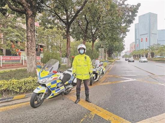 羊城晚报讯 记者张闻报道:秋衣外套上毛衣、毛衣上再套上一件毛背心、毛背心外再套上一件棉衣,最后再套上雨衣、戴上皮手套——1月31日除夕日上午7点30分,佛山市公安局南海分局交警大队机动中队副中队长杨舸“全副武装”走出家门。他所在的机动中队,就是市民们耳熟能详的交警“铁骑”队。