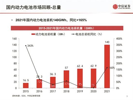 中信证券发布的《新能源汽车动力电池行业专题报告:2021年国内动力电池市场回顾》显示,2021年国内动力电池装机140GWh,同比增长165%,其中2月份受2020年疫情低基数影响,增速更是高达622%。