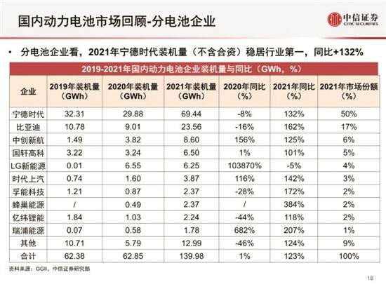 具体到电池企业,2021年宁德时代装机量(不含合资)和占比为69.44GWh(50%),同比+132%。在其之后,行业前五分别是比亚迪、中创新航、国轩高科和LG新能源,装机量和占比分别为23.56GWh(17%)、8.6GWh(6%)、6.5GWh(5%)、6.25GWh(4%)。从中不难看出,宁德时代国内市场份额稳居行业第一。