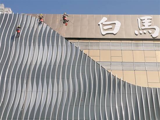 新年伊始,闻名全国的服装批发中心——广州白马服装城,3个“蜘蛛人”在清洗外墙。墙上装饰着波浪纹形线条,“蜘蛛人”宛如冲浪般飞跃在浪尖上。正午的阳光下,一幅夏日海边风景,跟底下大街的杂乱无章形成强烈反差。