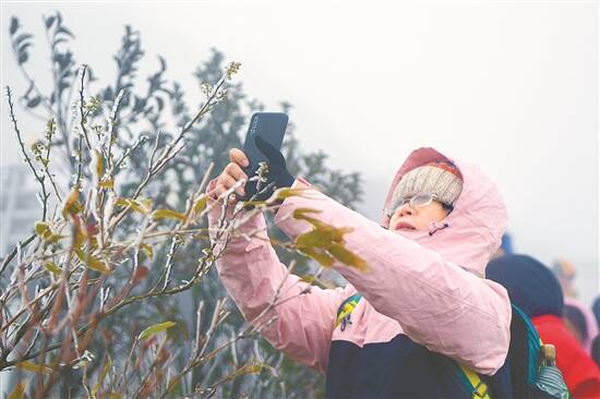 广东也有地方“常年有冬”,图为游客在清远金子山欣赏冰挂 羊城晚报记者梁喻 摄