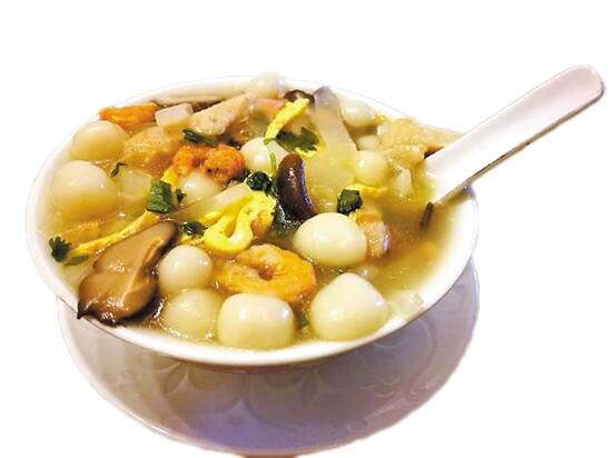 比起各种以黑芝麻、花生作馅的甜汤圆,台山咸汤圆则是另一番风味。它的馅不是包在汤圆里面,而是把糯米搓成圆,材料煮汤底。