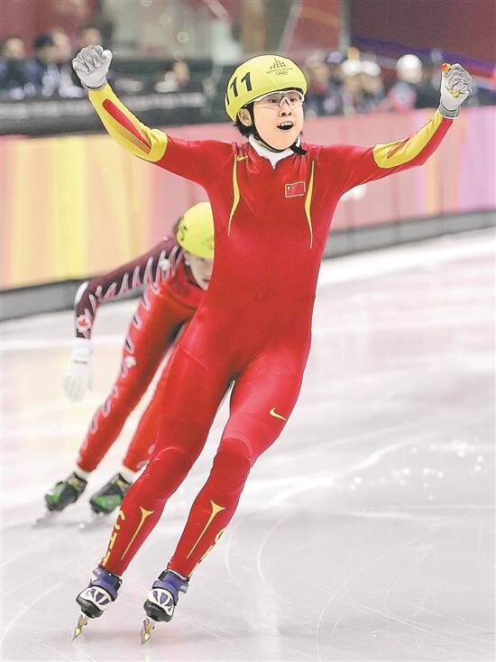 2006年2月15日,都灵冬奥会短道速滑女子500米决赛,王濛庆祝获胜 资料图/视觉中国