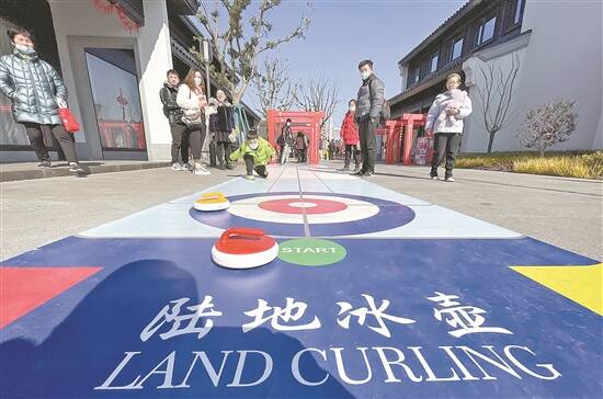 北京冬奥会正在举行,江苏海门常乐镇柳西半街新春庙会上,陆地冰壶运动吸引了不少游客。