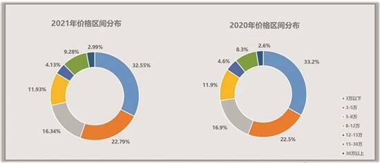 其中,5万元以下价格区间与前一年同期相比下降了0.37%,5万~15万元价格区间与前一年同期相比下降了0.99%,15万元以上价格区间与前一年同期相比增长了1.36%。