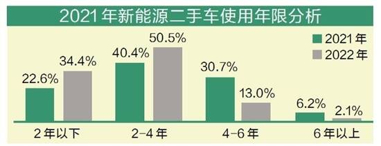 在新能源二手车使用年限方面:使用年限在2年以下的占比22.6%,同比下降11.8%。2~4年占比40.4%,同比下降10.1%。使用年限在4~6年的交易量占30.7%,同比增长17.7%。使用年限在6年以上的交易量占6.2%,同比增长4.1%。