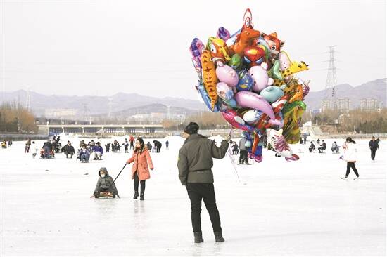 市民游客在清水河冰面上滑冰游玩