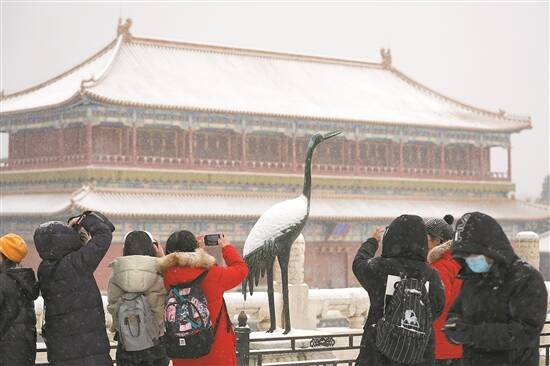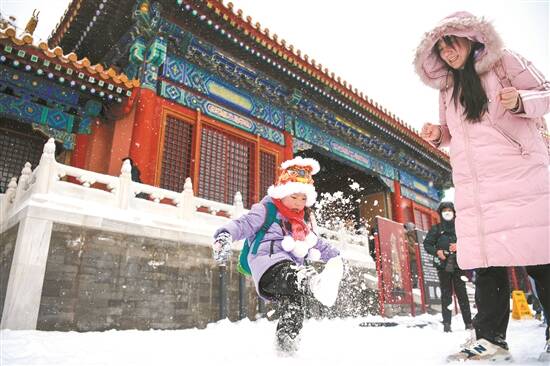 小朋友在故宫雪地里玩雪撒欢
