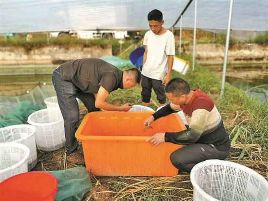 近日,位于梅州市五华县横陂镇的广东省悯农农业科技发展有限公司苗种孵化场一片热闹景象。公司员工在虾塘里用一张大网捕捞罗氏沼虾成品。随后,大家按照大小对捞上来的虾进行分检,大的有0.5两,小的也有0.2两。分检过后,员工对虾进行分装。
