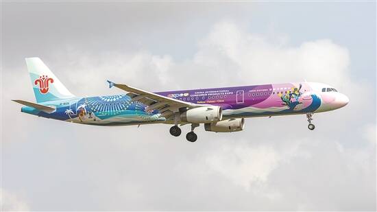 首架消博会主题彩绘飞机上岗 13日,在第二届中国国际消费品博览会倒计时30天之际,全球首架消博会主题彩绘飞机——南航“消博号”在广州正式亮相,并在当天成功执行广州至海口的首航航班。 (唐珩 南宣)