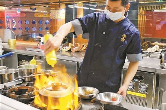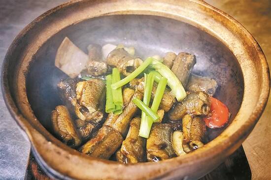 下午5时左右,在银记不远处的啫神逐渐有食客入座,透过玻璃橱窗,可以看到厨房内的大厨们正忙着处理食材。油锅预热,长度一致的菜心经过翻炒后,鲜嫩清新;新鲜黄鳝被大厨放入瓦煲中高温烧焗。上菜时,侍应必连盖子一煲端,待掀起盖子时,煲内发出的“啫啫”声立马袭来。只见热汁四溅,食客们闻香开胃,一顿饭便热热闹闹开始了。
