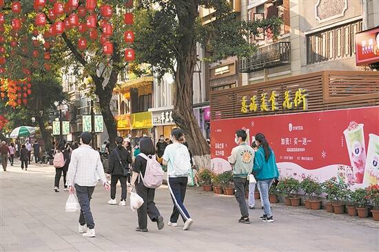 依托“广府庙会”“广州国际美食节”“广府文化旅游嘉年华”等活动,惠福美食花街汇聚了众多具有岭南特色的知名菜品,如陈添记鱼皮、张太公竹篙粉、清心鸡、沙田乳鸽等。其中,汇集粤式传统小吃的庄臣美食坊尤其亮眼,有不少外地游客想一探岭南美食风味,慕名而来。“听说在这里能吃到地道的广府传统小吃,云吞面、鱼皮等味道都不错。”王小姐和朋友从北方来广州旅游,在惠福美食花街能找到从未吃过的岭南风味,而“人行道比车道还宽”是惠福美食花街给王小姐留下的第一印象。