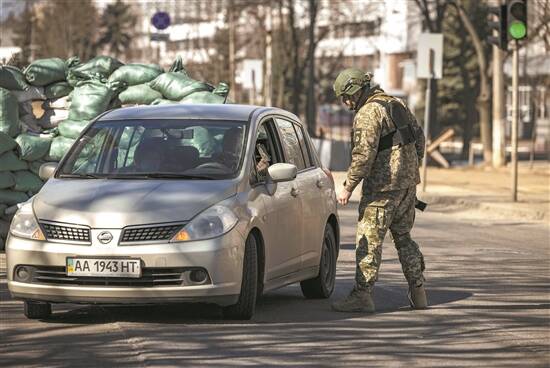 3月21日,乌克兰军人在基辅的一个检查站检查过往车辆 图/人民视觉