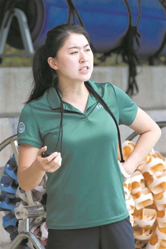 “用上点劲”“十秒七,再快点”“顶住顶住”……中山大学南校园,英东游泳馆里,一道绿色的身影在50米游泳池边来回穿梭,手里拿着计时器,边走边大声喊着。