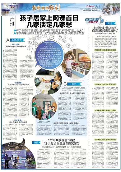 其他中小学同样有序开展网课教学。华师附中实验小学各学科老师自己准备网课内容,直播为学生授课答疑;西关培正小学在网课课堂之外,通过QQ群、微信群等方式,解答学生、家长提出的问题,最大限度保证授课质量;广雅中学初一年级,通过云端会议软件,把本周线上课都安排在同一个会议号码上课,操作便捷,作业、电子课本、微课、复习资料等均可同步查看……