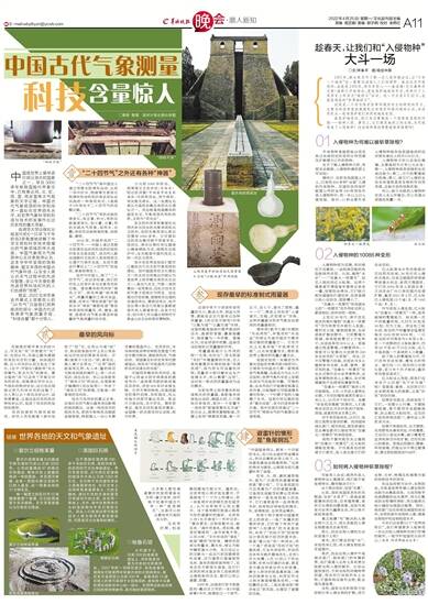 但作为中国人,除了“二十四节气”,还应该知道,我们的历史上还有许多与天象有关的记载。诸如最早的风向标“候风之羽”、测风神器“相风铜乌”,测量雨量的工具天池盆、圆罂,还有从“琴弦测湿”到“挂炭天平”再到“鹿筋吸湿”等各种观测和测量风、雨、雷电、温度、湿度和古气象台等各种装置和气象测量科技手段。
