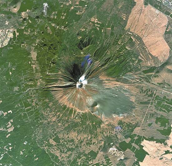 富士山山体高耸入云,山巅白雪皑皑,站在远处看,它好似一把悬空倒挂的扇子。它是日本的重要象征之一,2013年被列入世界文化遗产名录。