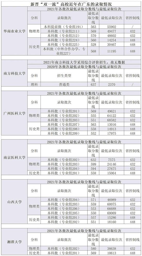 录取批次方面,今年广州医科大学、南京医科大学、湘潭大学、山西大学和华南农业大学在广东的录取批次均为本科批次。除本科批外,华南农业大学还在本科提前批有招生计划,共分两批次招生。